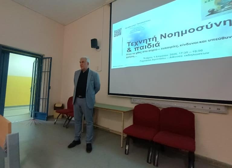Την Τετάρτη 1 Απριλίου 2026, στο πλαίσιο του «Σχολείου για Γονείς», στην 7η μας συνάντηση, συναντηθήκαμε στο Αμύνταιο για να μιλήσουμε για την Τεχνητή Νοημοσύνη (ΤΝ) και τον καθοριστικό ρόλο που διαδραματίζει στην καθημερινότητα, την εκπαίδευση και την εξέλιξη των παιδιών και των εφήβων.